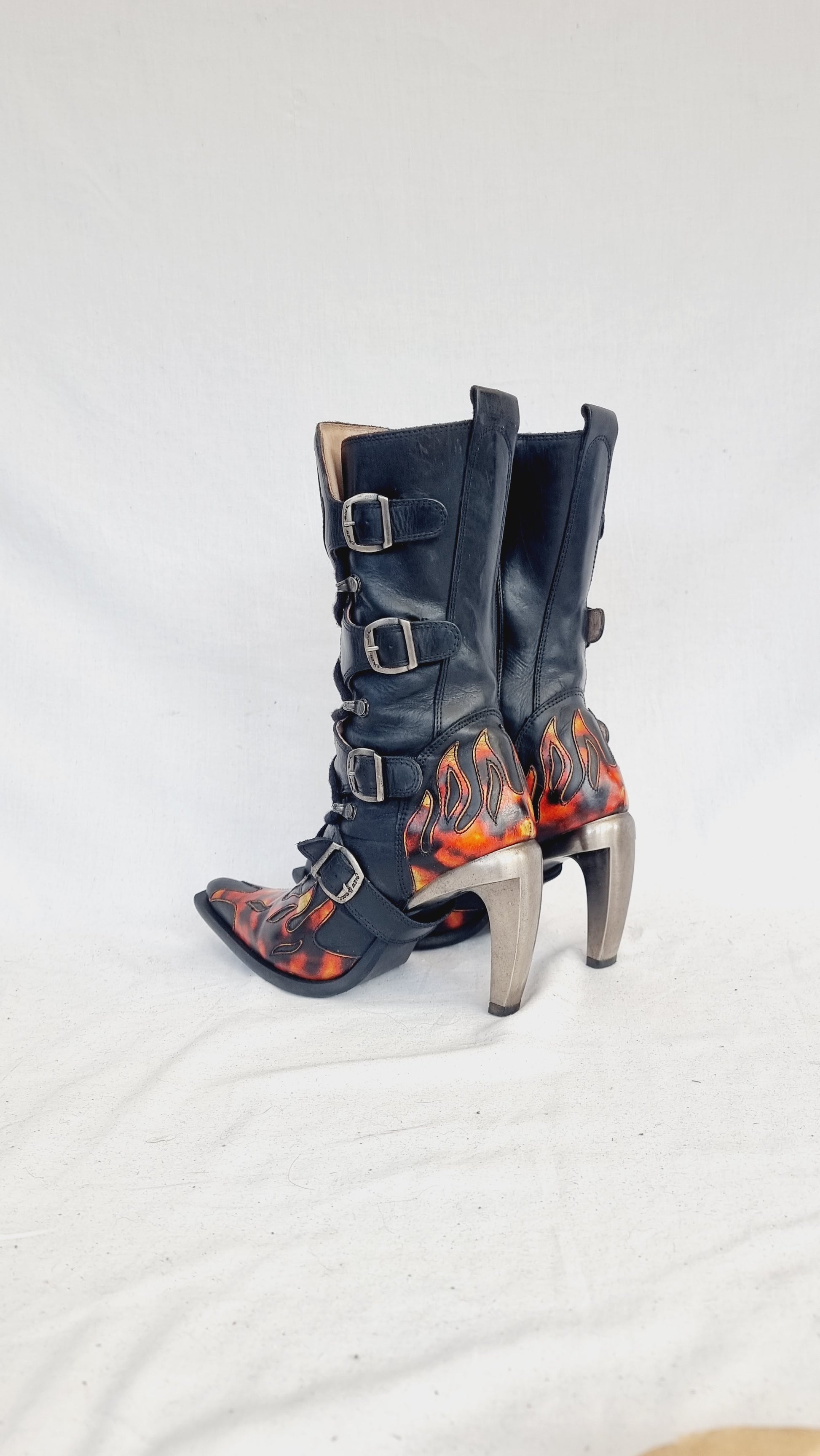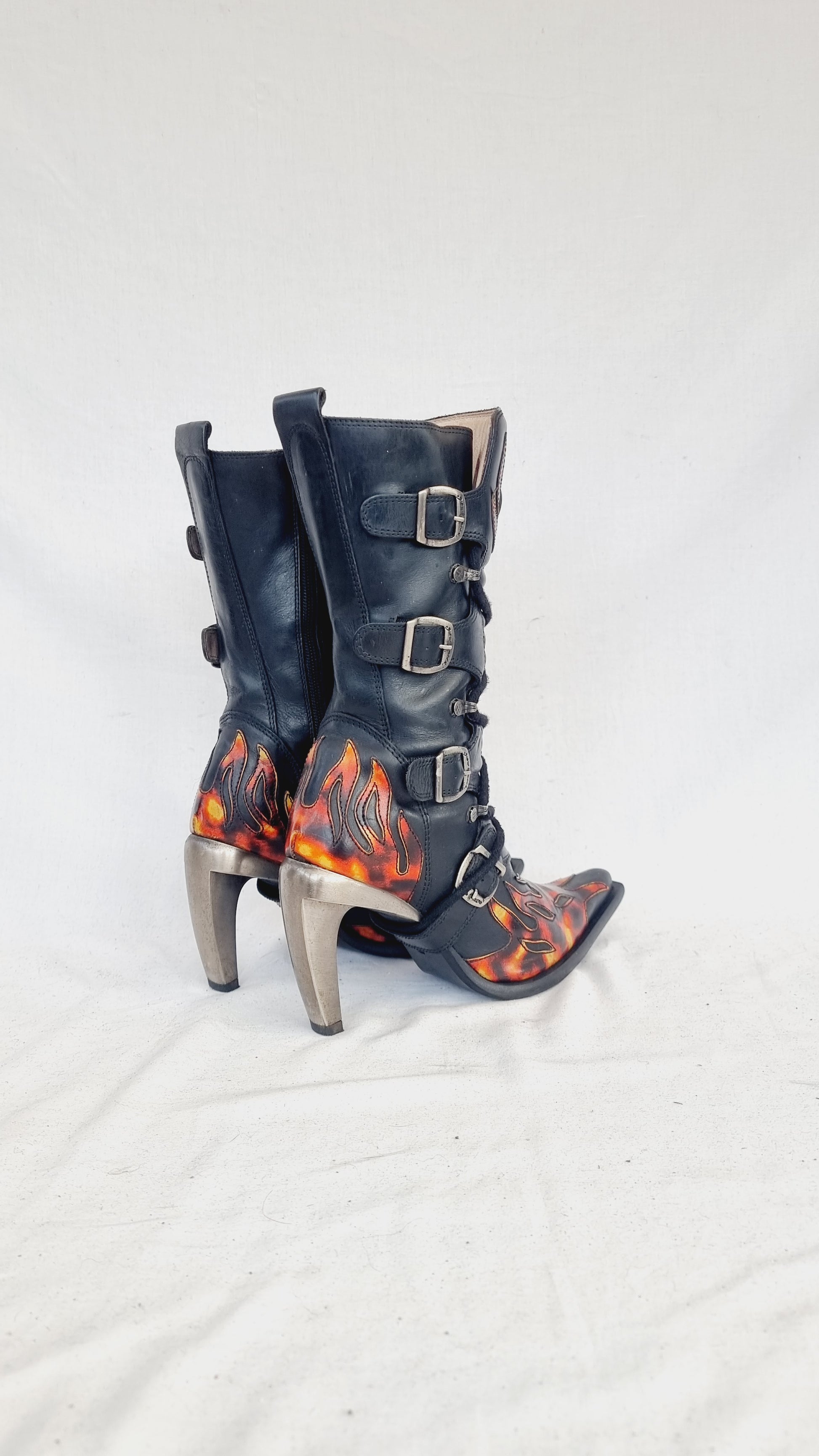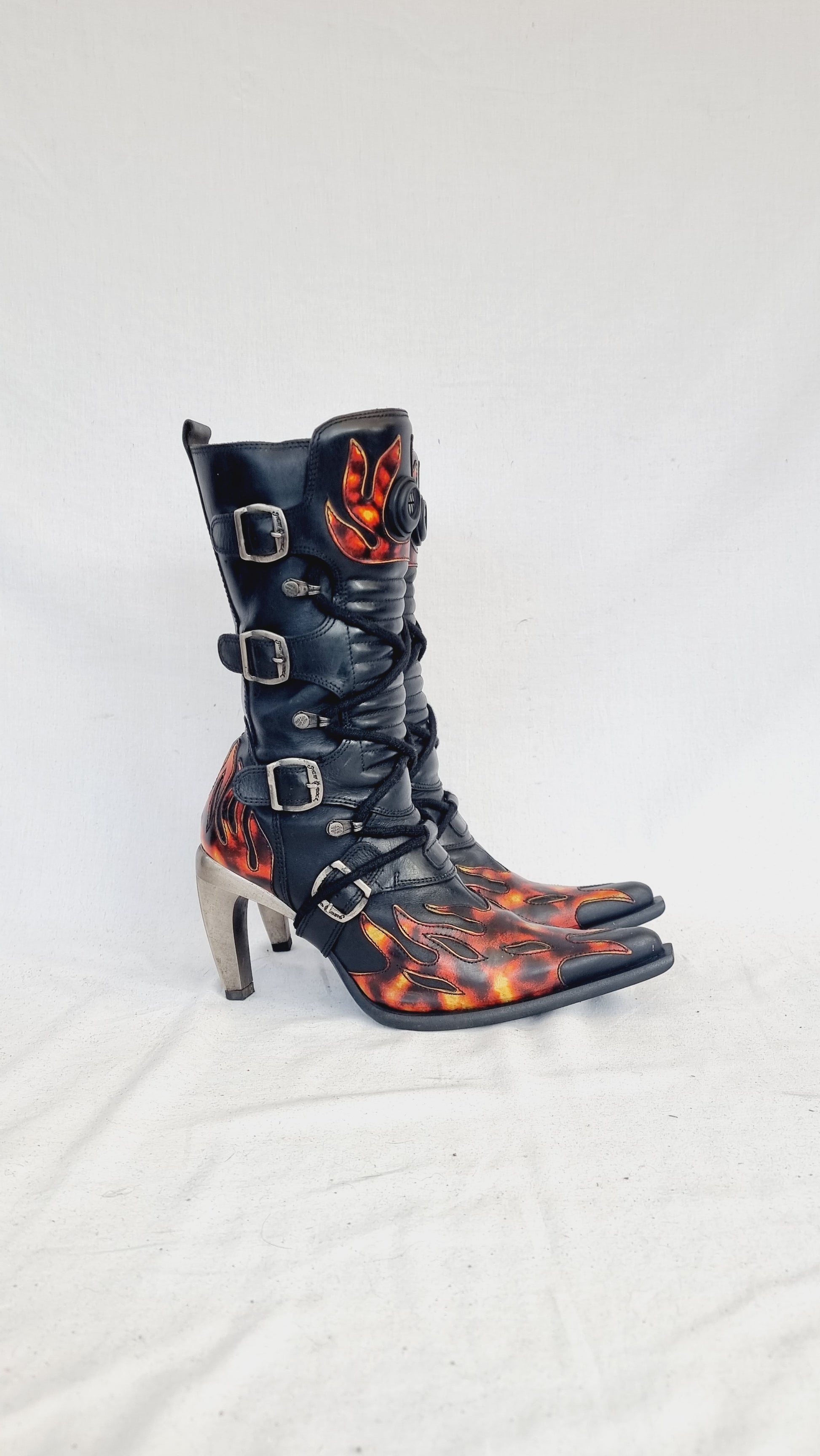 New Rock boots with chunky stiletto heels, pointed toes and lace up fronts. They feature a black and red flame design at different sections across the leather. The buckles and laces are fully adjustable, but there are also inner zips for ease of use. Unlike most New Rocks, these are pretty lightweight and don't have huge platforms. The sole is made of a high quality anti aqua planing rubber from the 90s / y2k era - the golden age when alternative footwear reigned supreme!