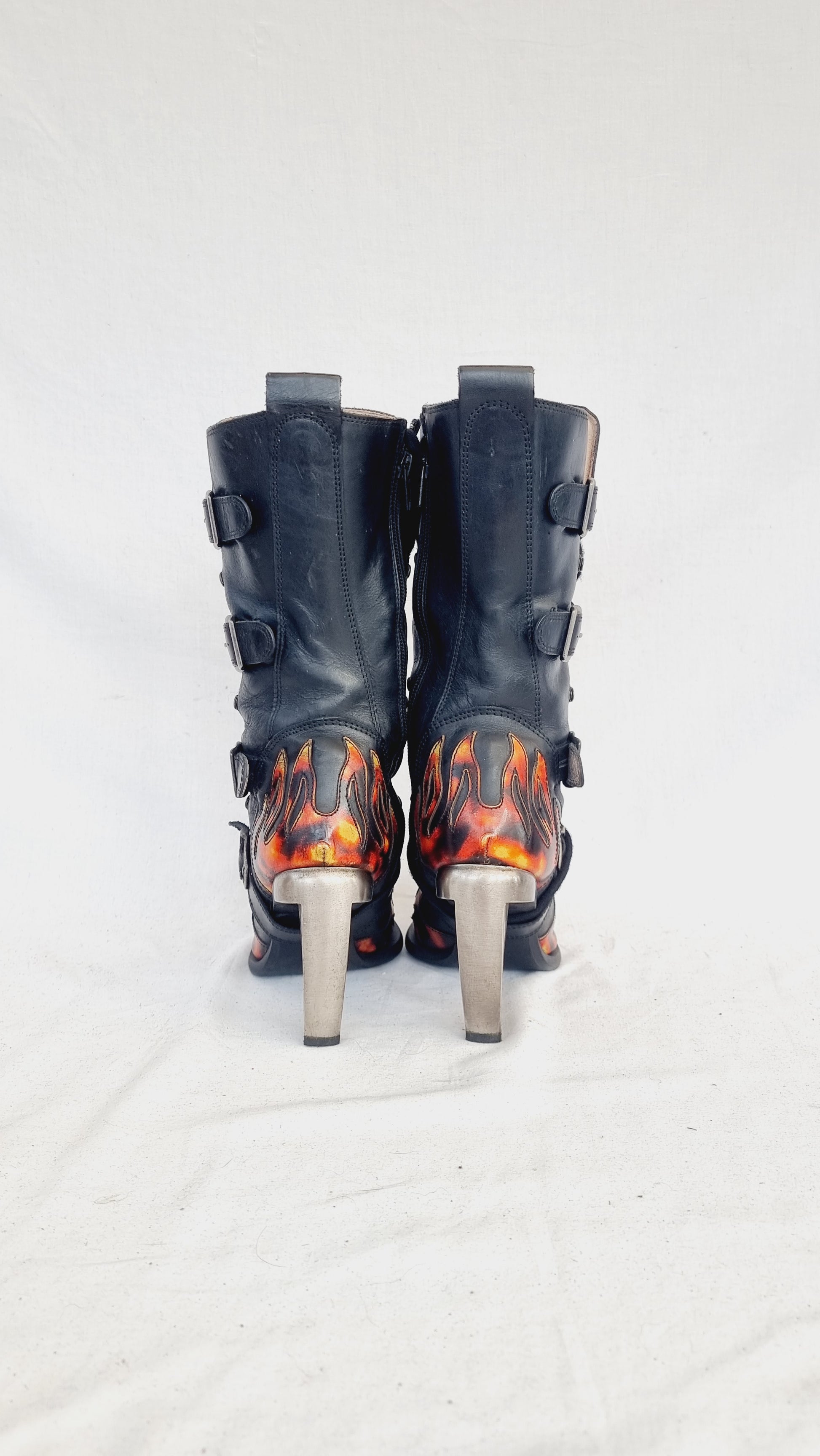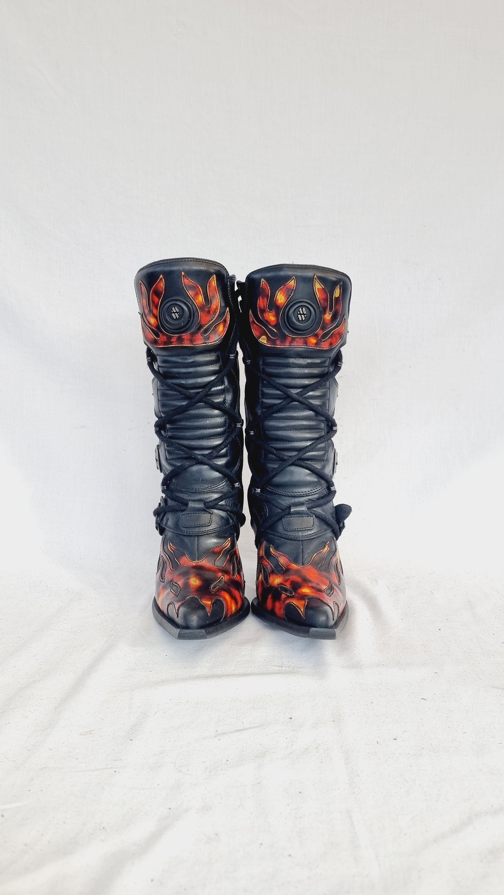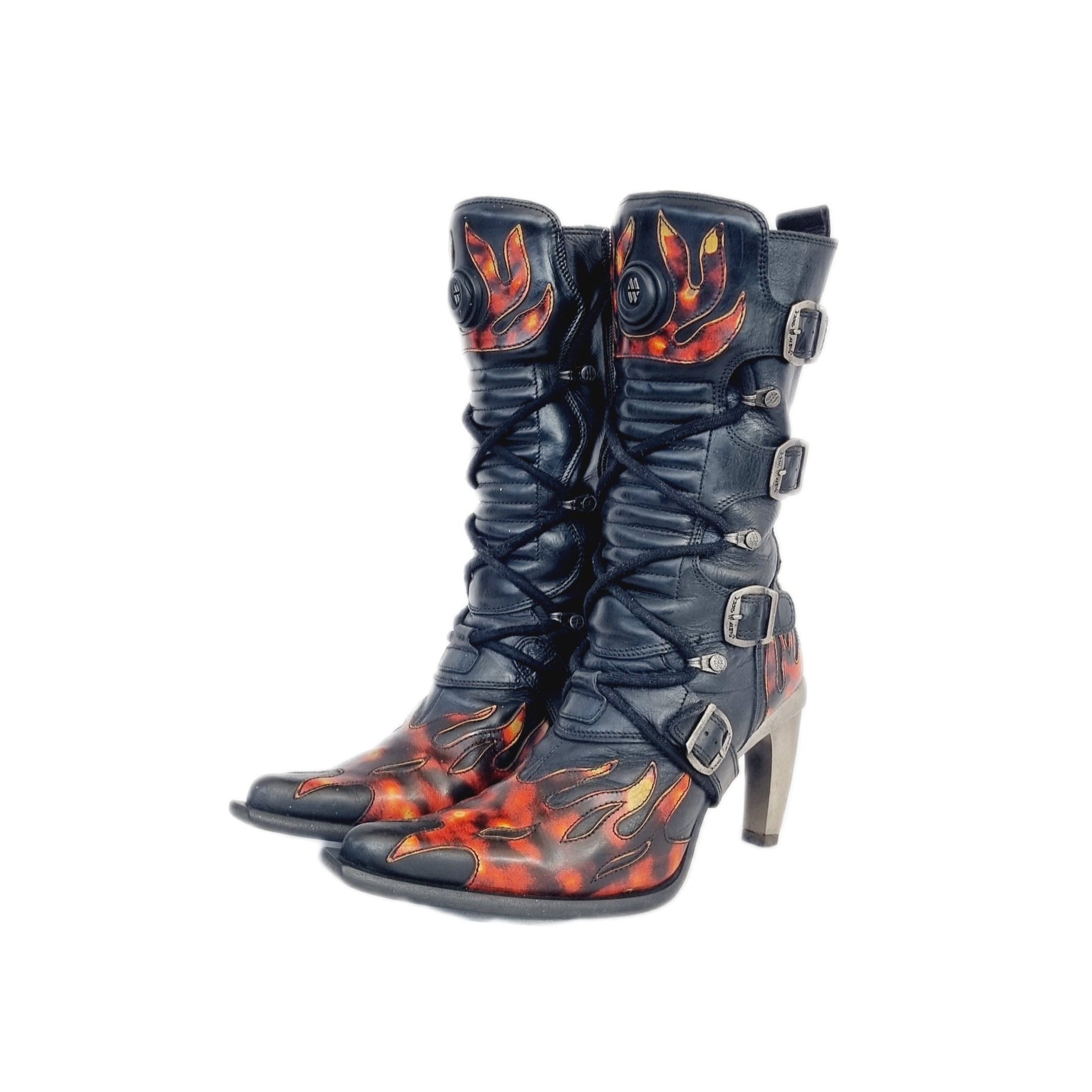 New Rock boots with chunky stiletto heels, pointed toes and lace up fronts. They feature a black and red flame design at different sections across the leather. The buckles and laces are fully adjustable, but there are also inner zips for ease of use. Unlike most New Rocks, these are pretty lightweight and don't have huge platforms. The sole is made of a high quality anti aqua planing rubber from the 90s / y2k era - the golden age when alternative footwear reigned supreme!