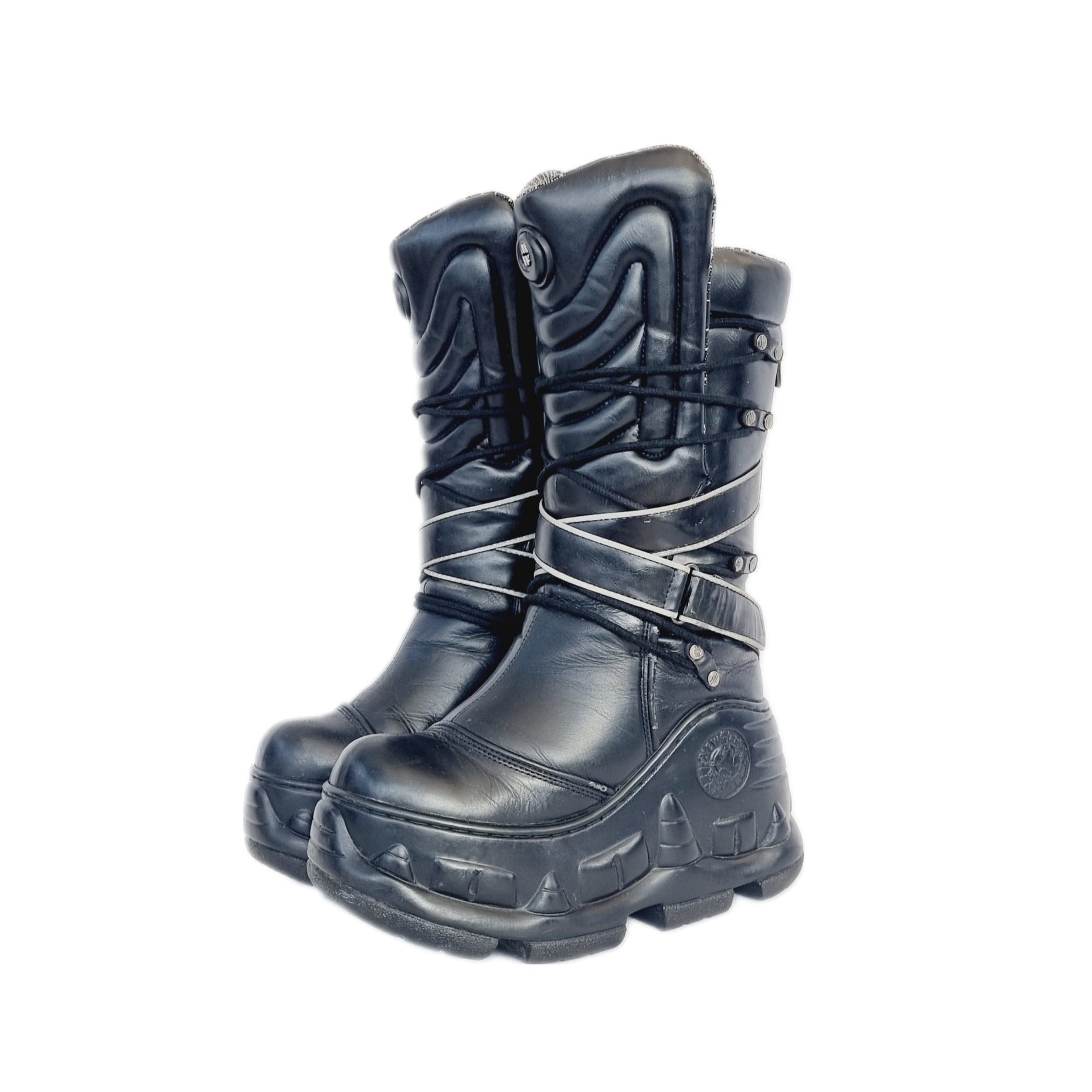 Genuine, original leather and metal buckled New Rock boots with chunky wedged platform soles, lace up fronts and Velcro straps. These wedge boots sit just above the ankle on chunky platforms, but the platform isn't so big that they become too impractical.