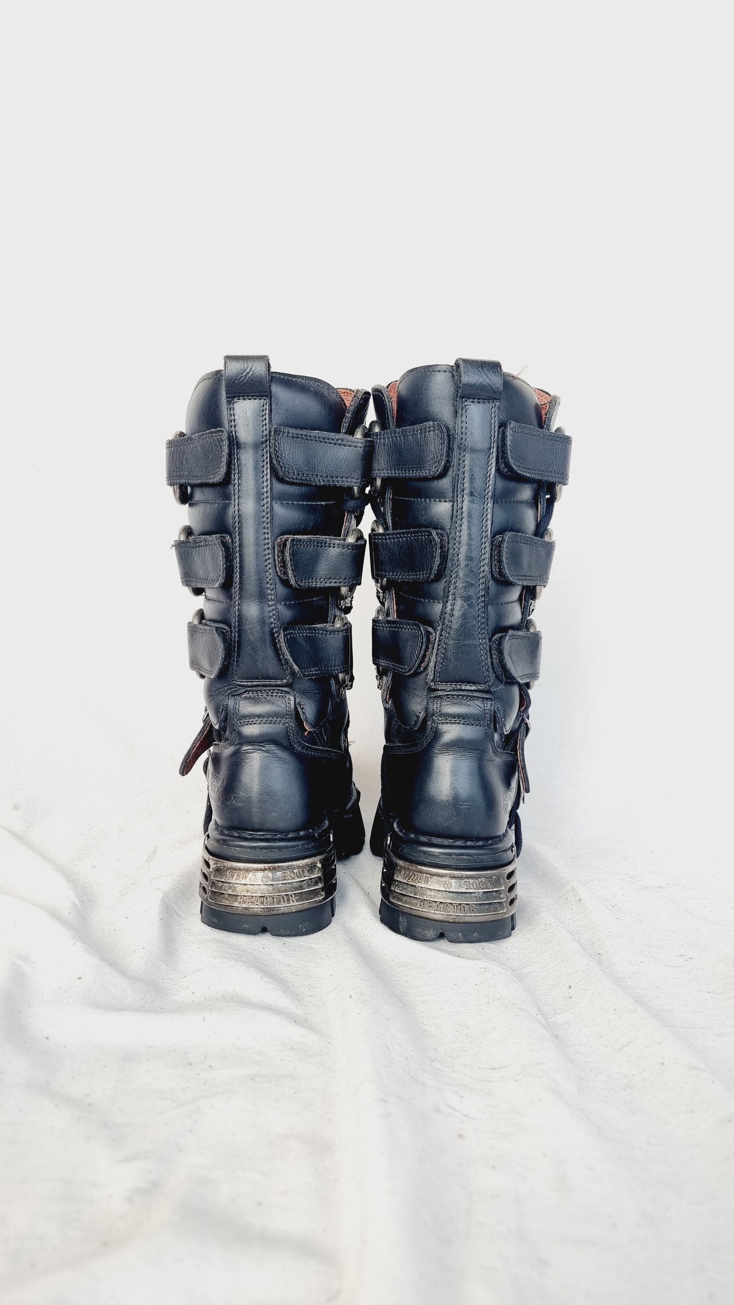 Leather and metal New Rock boots with lace up fronts and Velcro straps. These tower boots are black in colour and sit a little above the mid calf. The buckles and laces are fully adjustable from the inside and outside of the boot.