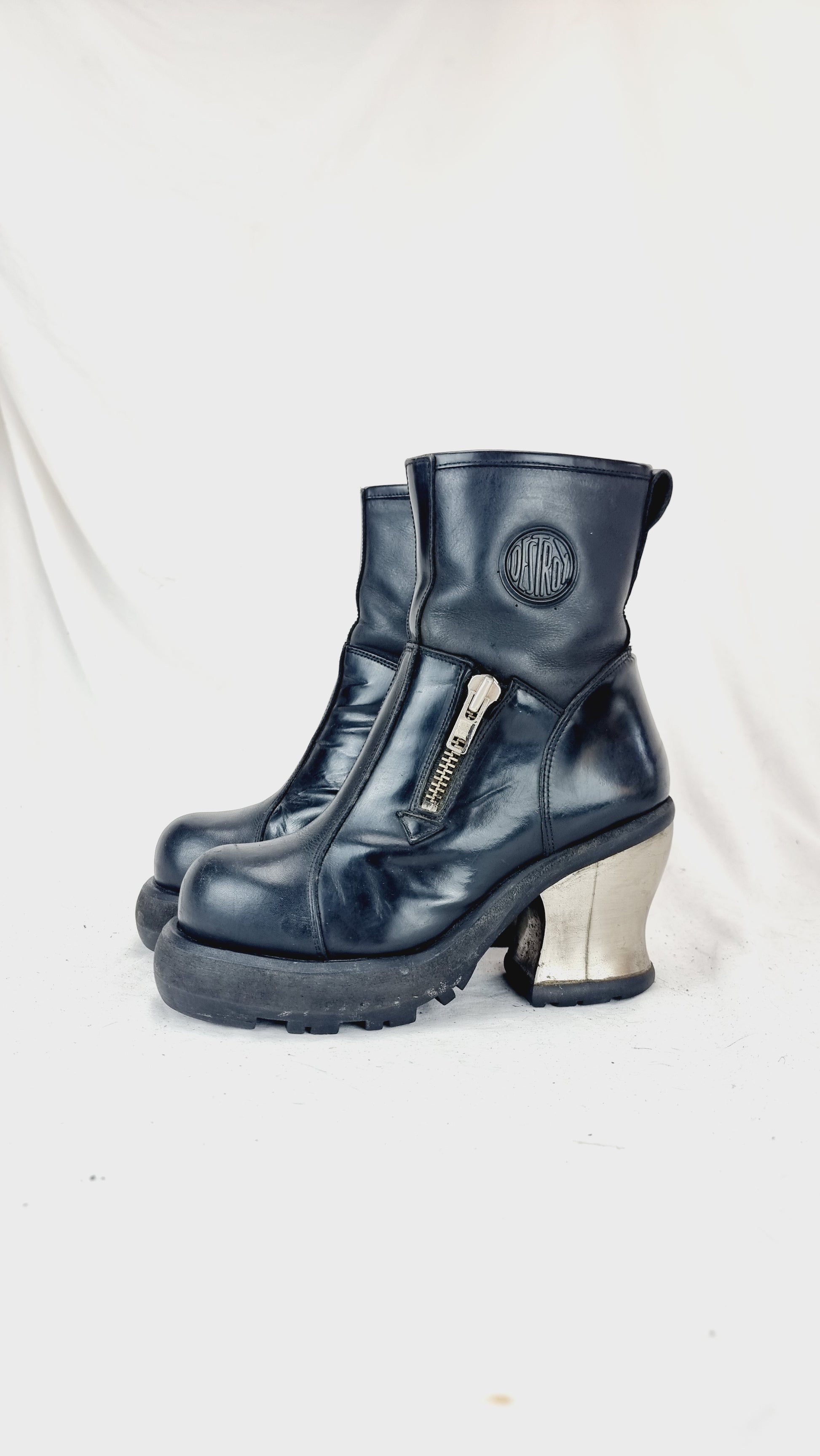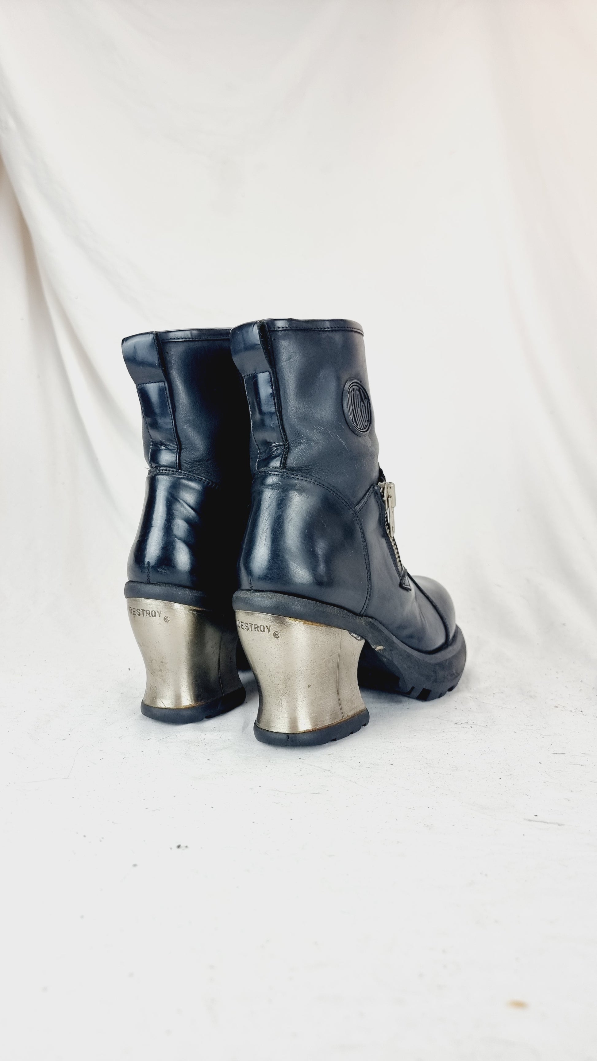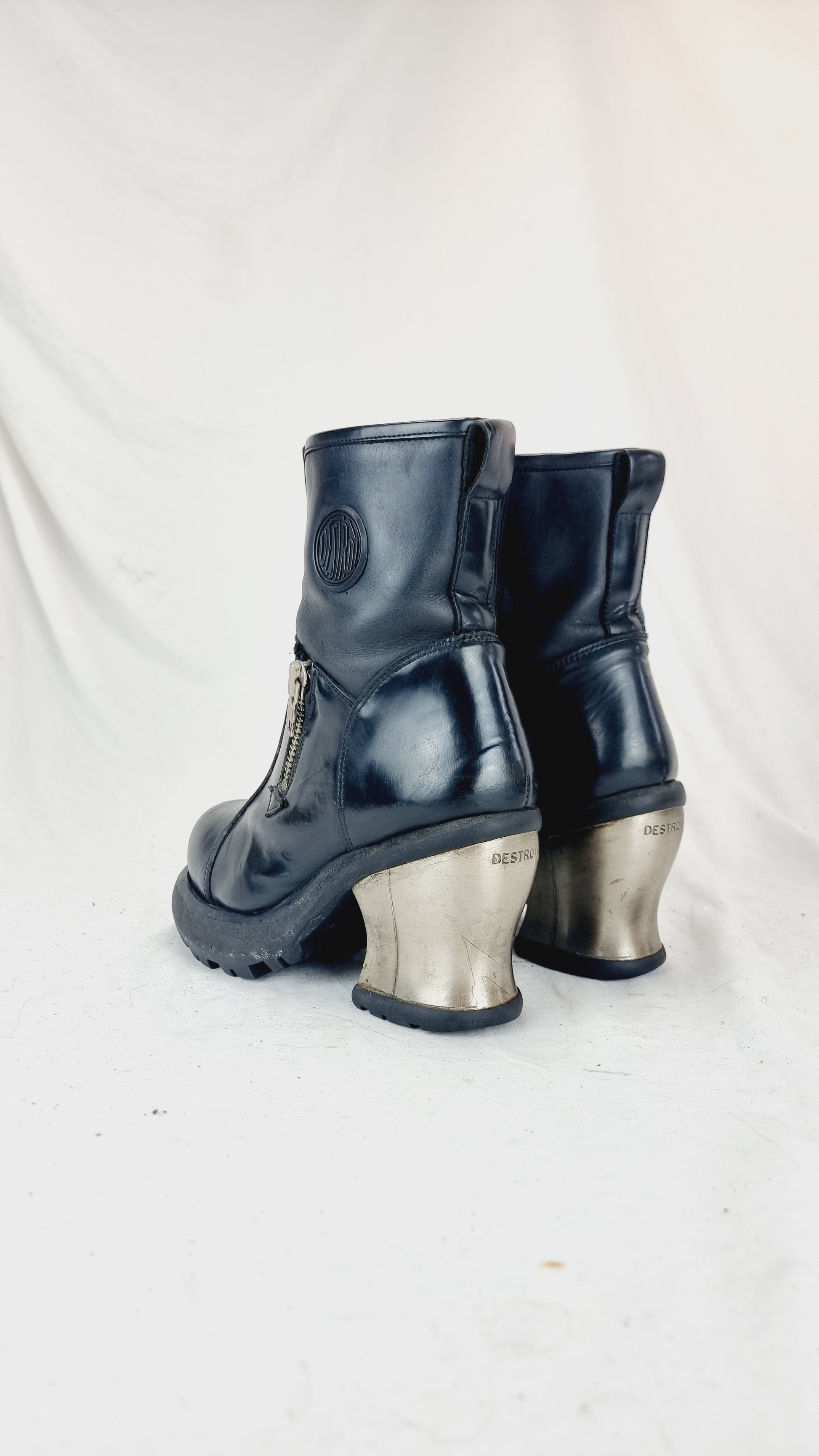 Rare vintage cyberpunk cybergoth wedged platforms by Destroy, a popular 90s brand. These gorgeous black platform boots sit on chunky heels and platform soles.