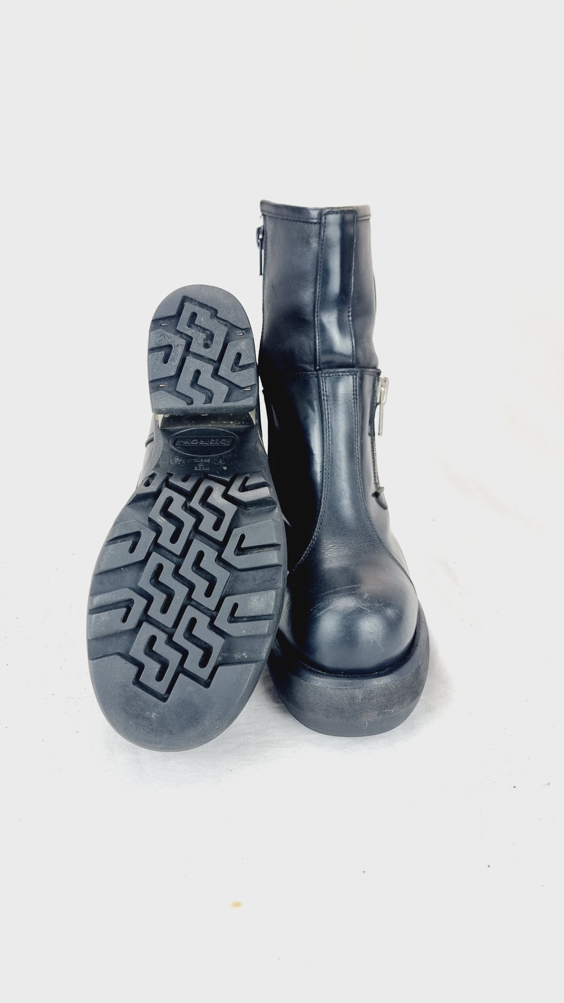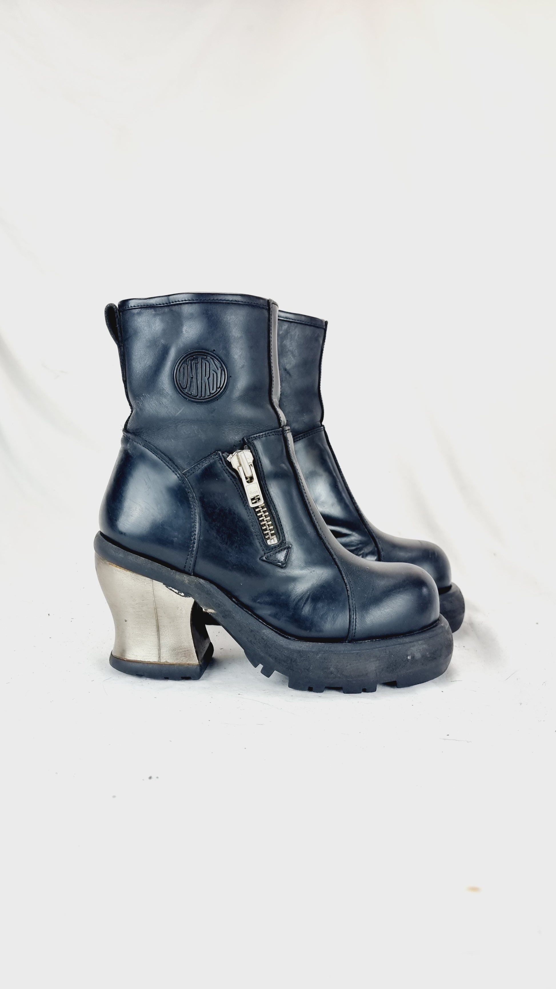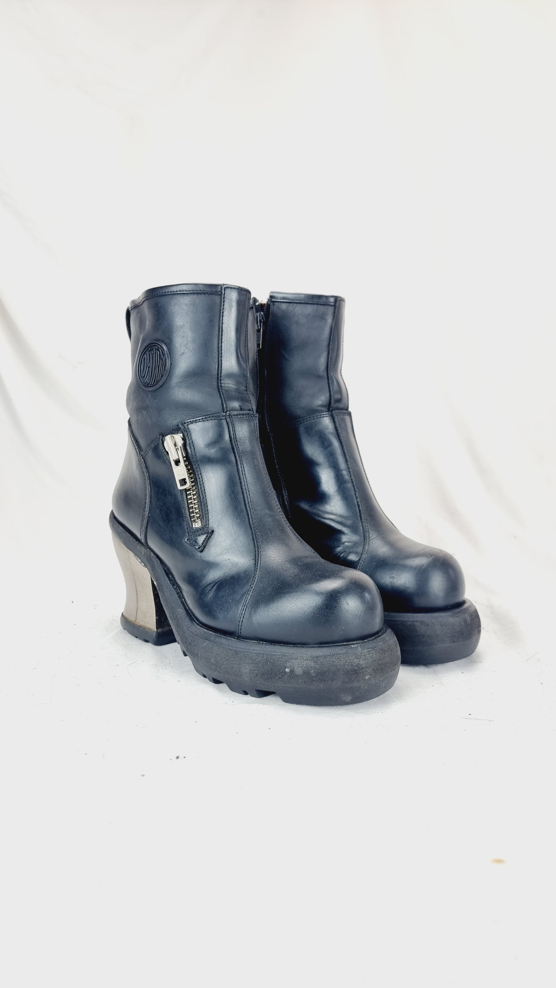 Rare vintage cyberpunk cybergoth wedged platforms by Destroy, a popular 90s brand. These gorgeous black platform boots sit on chunky heels and platform soles.