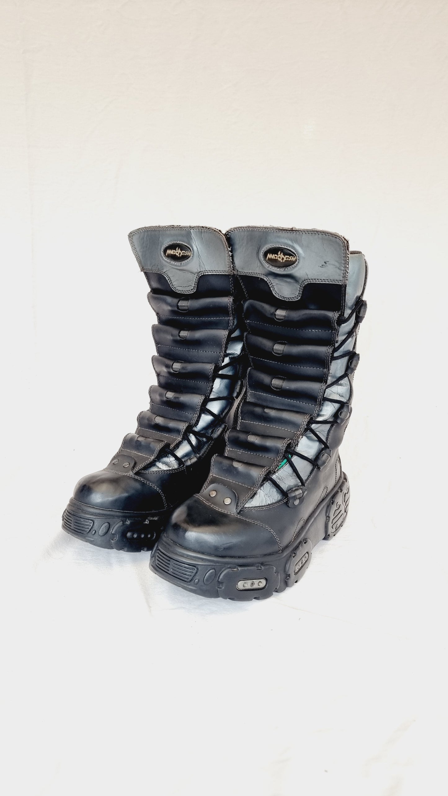 Early to mid noughties Mad Fish goth boots. If you were a vegan goth in the mid 00s these were THE boots to have - 100% vegan and cruelty free. Very comfy and in good shape internally. They are fairly heavy, but much less so than new rocks / new rock boots, and the uppers are more flexible.