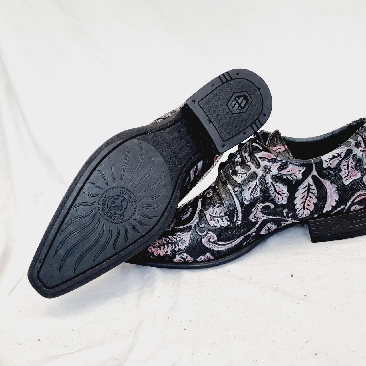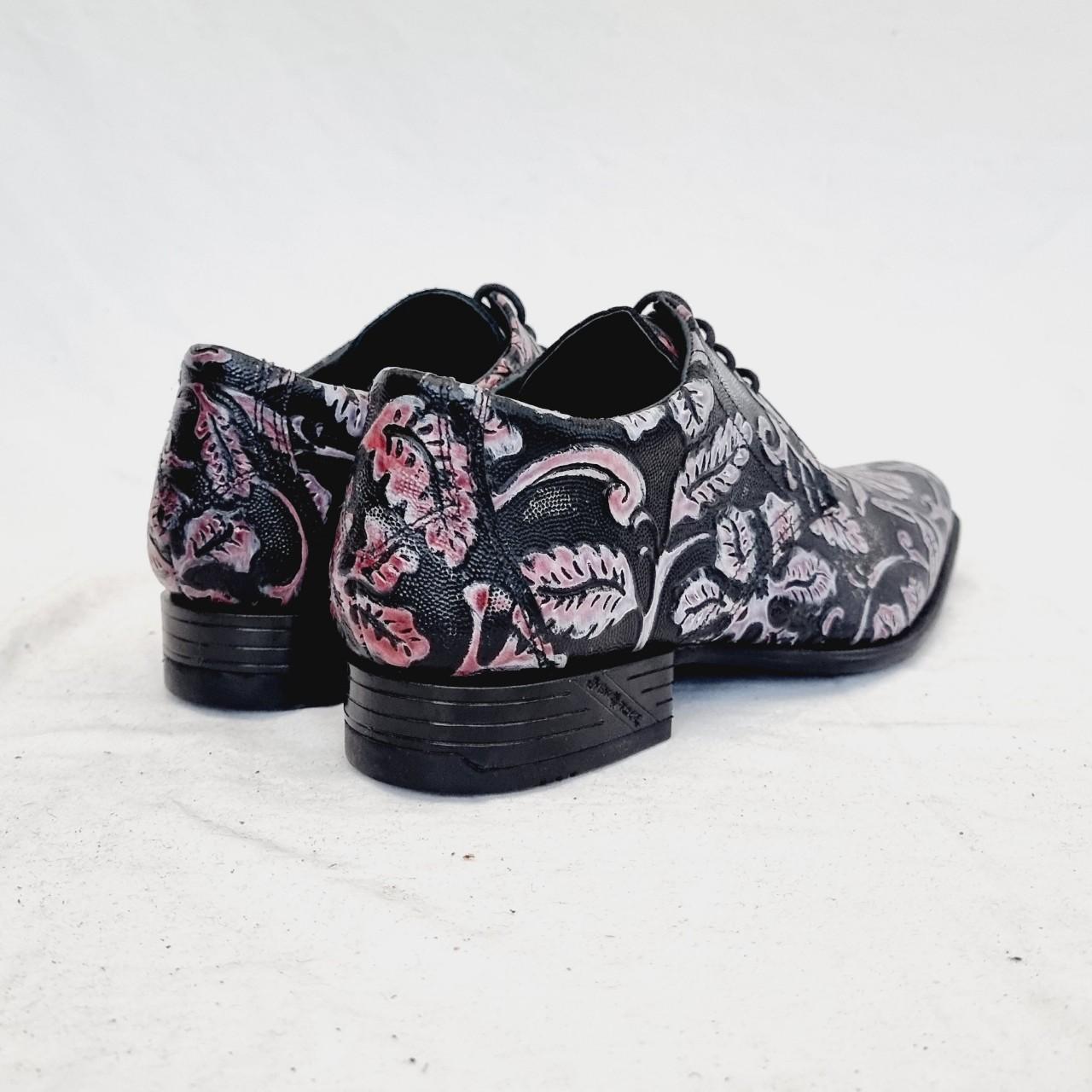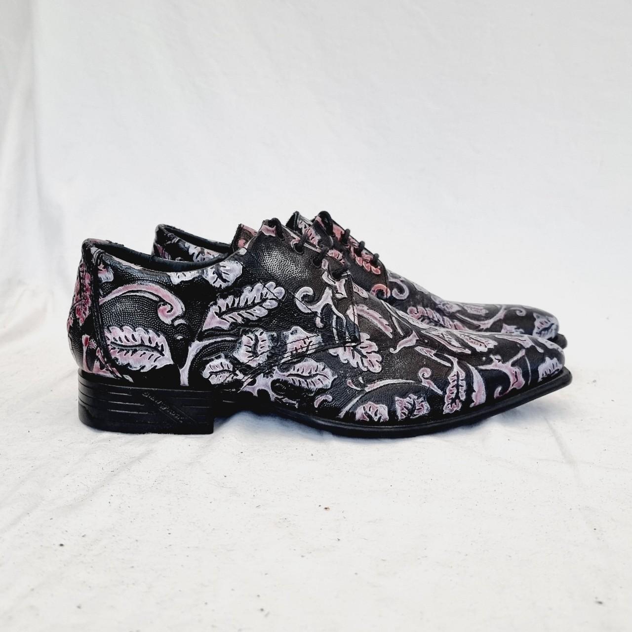 Original leather metal New Rock shoes with pointed toes and lace up fronts. Pattern is a grungey paisley effect in black, purple and pink. Shape is really unique, yet the vibe is still smart casual, but with a twist.