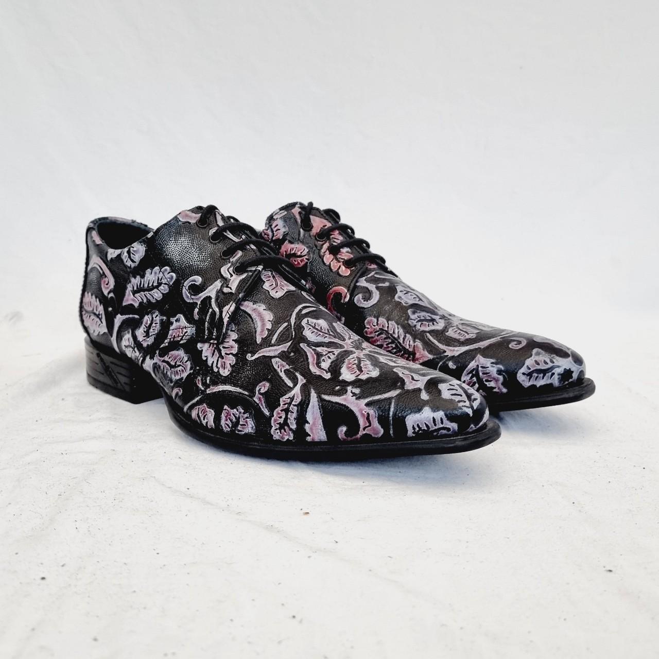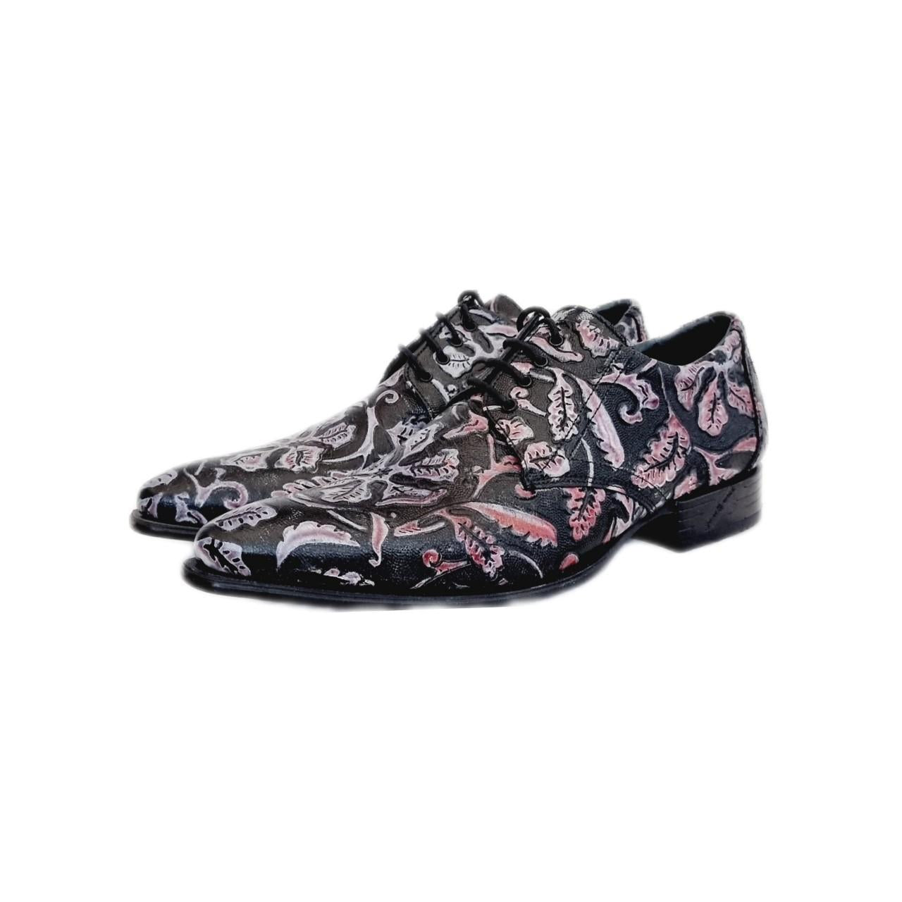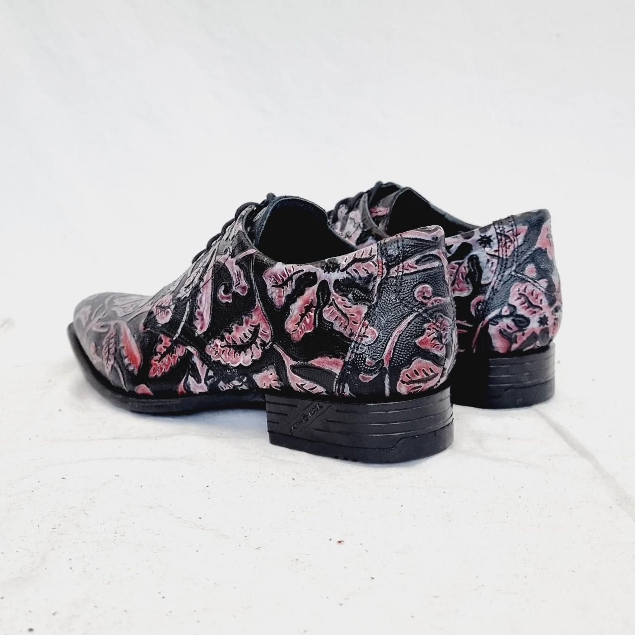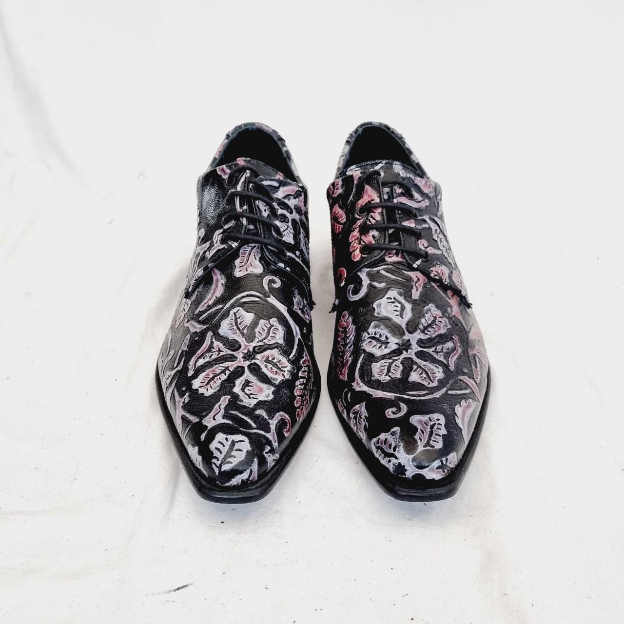 Original leather metal New Rock shoes with pointed toes and lace up fronts. Pattern is a grungey paisley effect in black, purple and pink. Shape is really unique, yet the vibe is still smart casual, but with a twist.