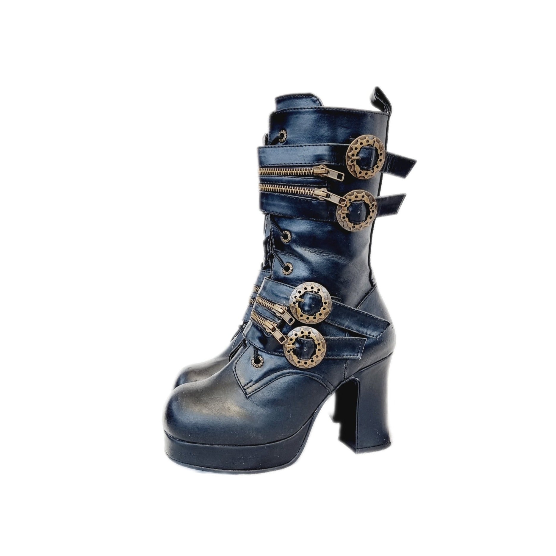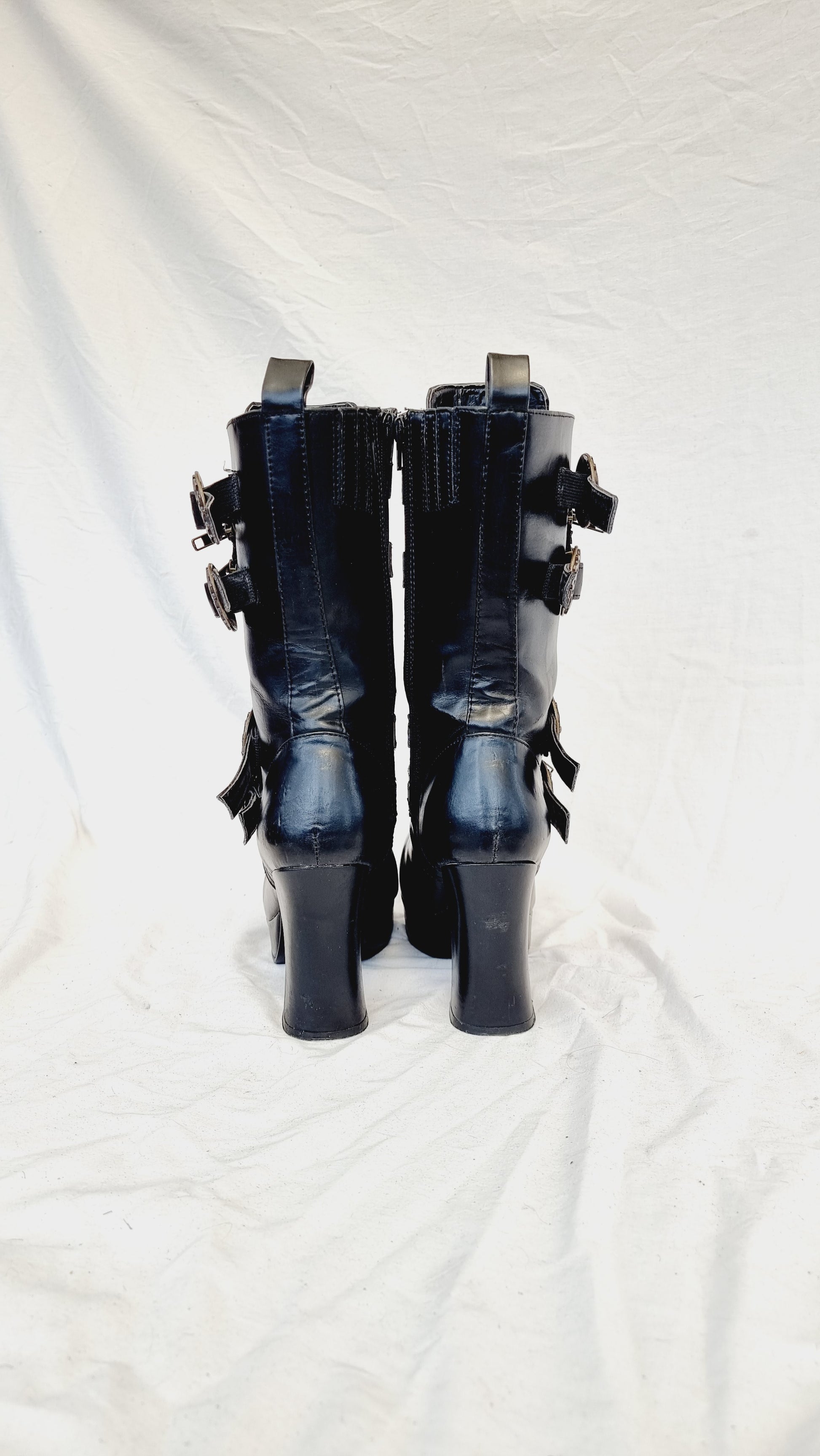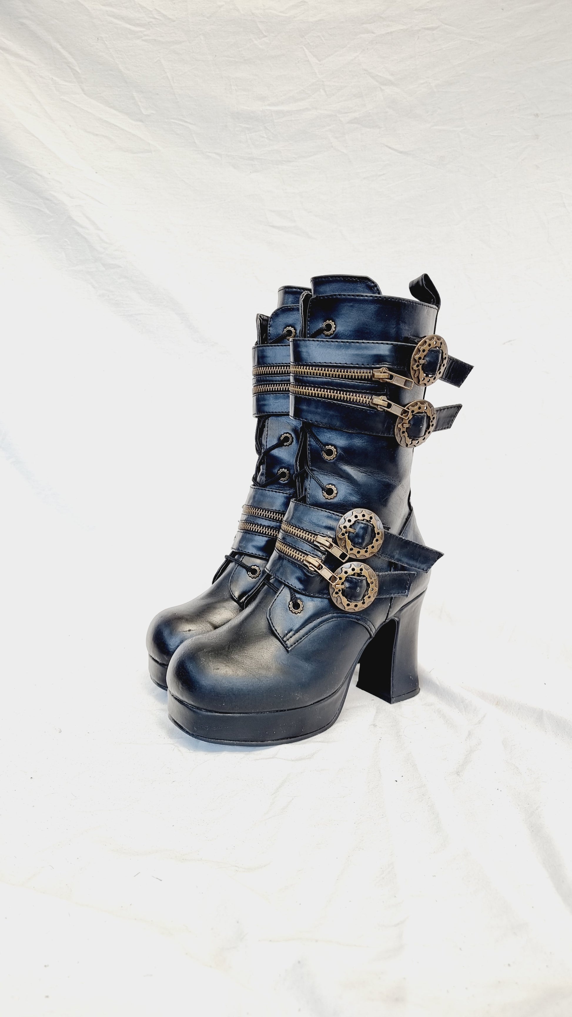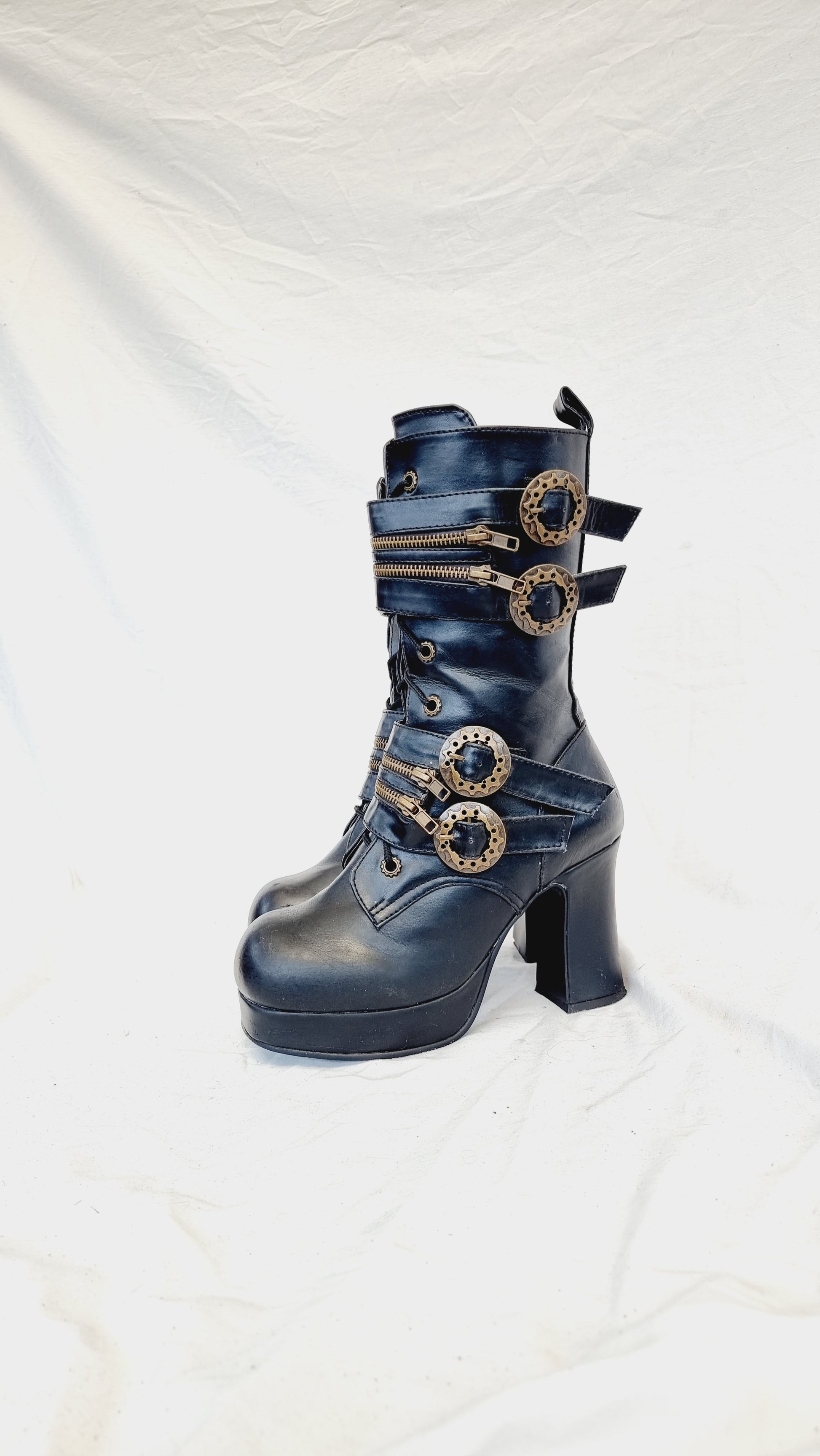 Rare black leather Demonia boots with chunky stiletto heels and Victorian style buckles. The buckles are fully adjustable, but there are also inner zips for ease of use. Like most Demonias these have chunky platforms, but they aren't so big they can't be used daily. Rather than a full-on platform, the sole is a couple of inches, made of high quality anti aquaplaning rubber from the 90s / y2k era - the golden age when chunky boots reigned supreme!