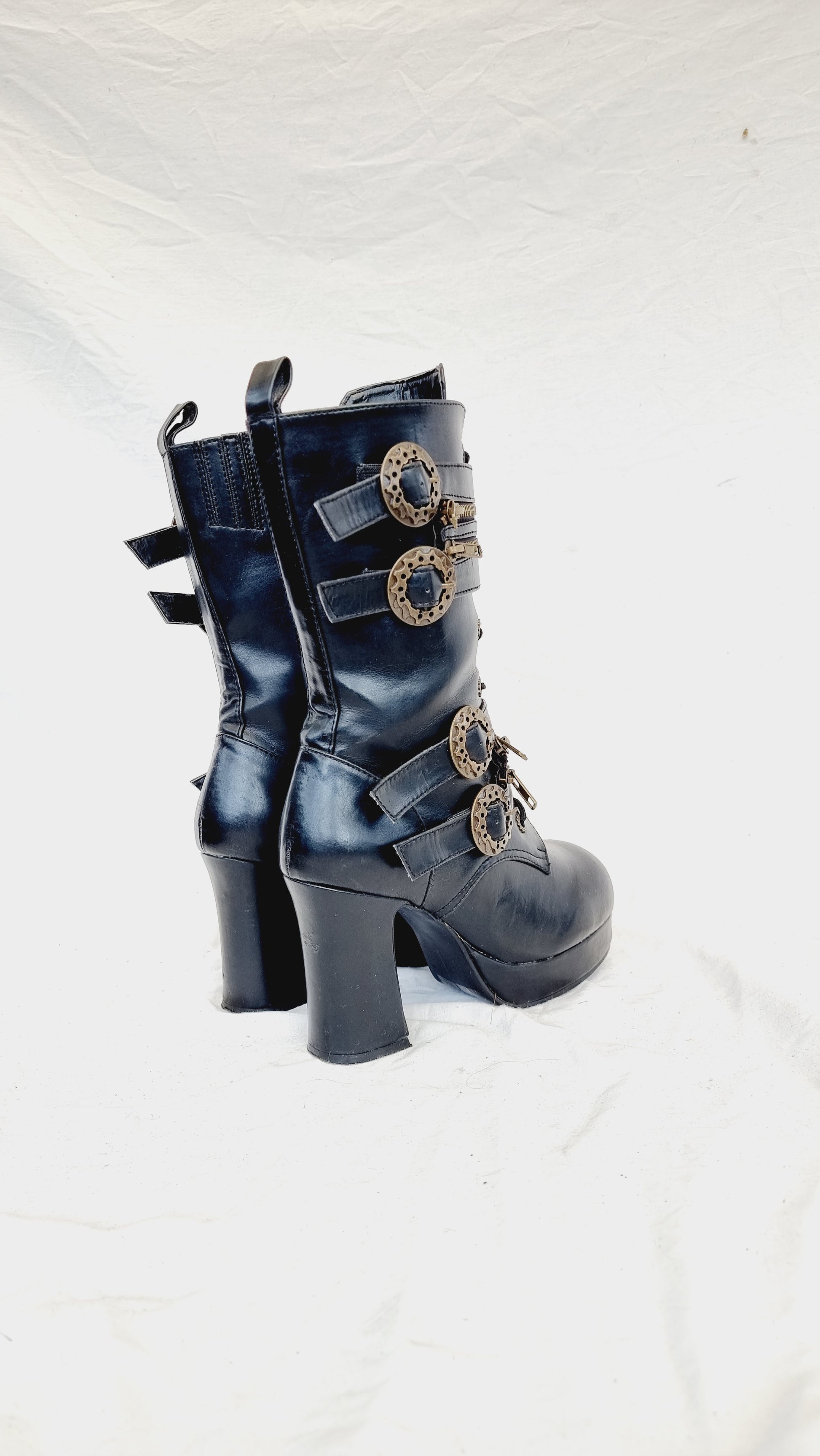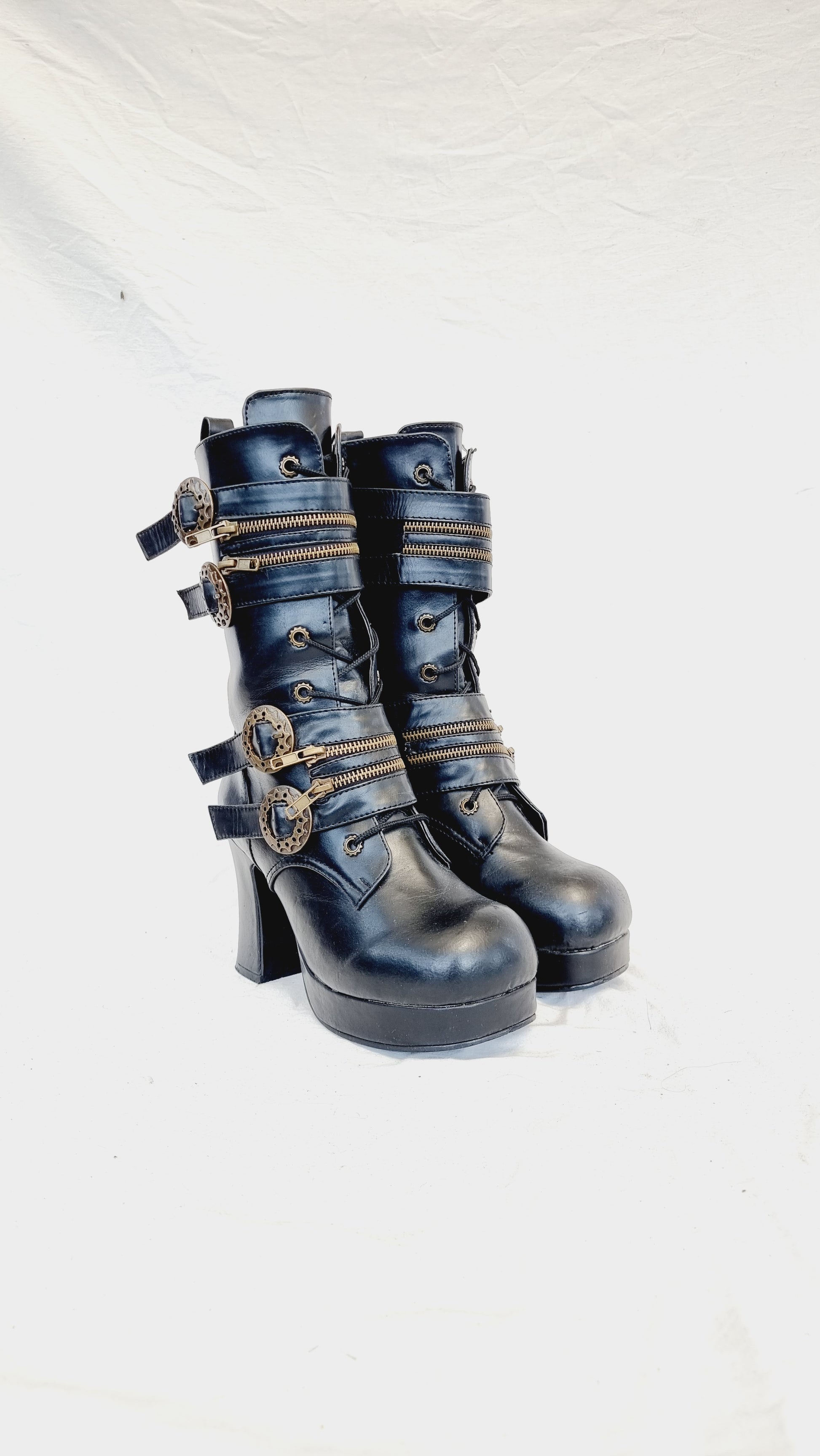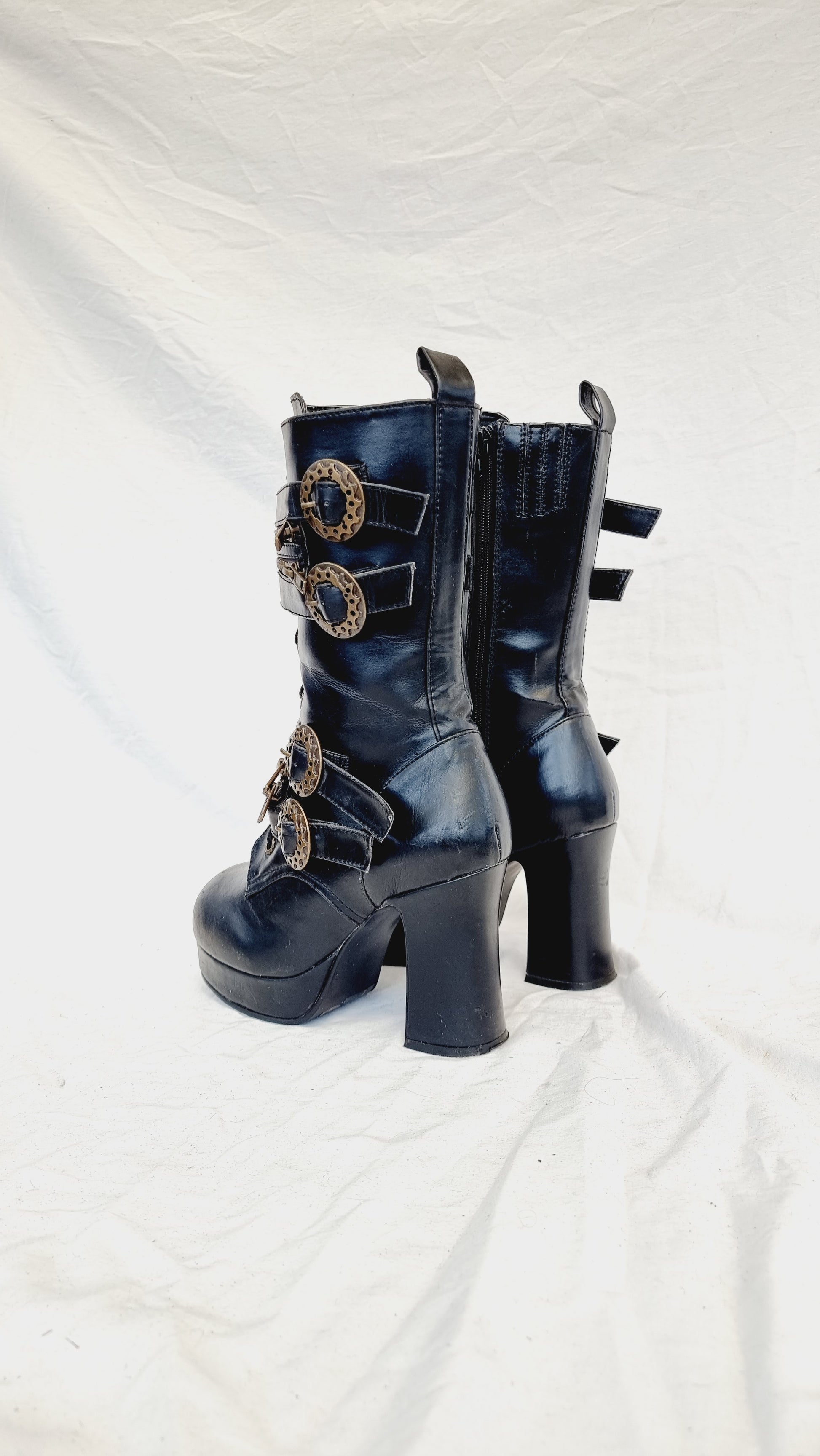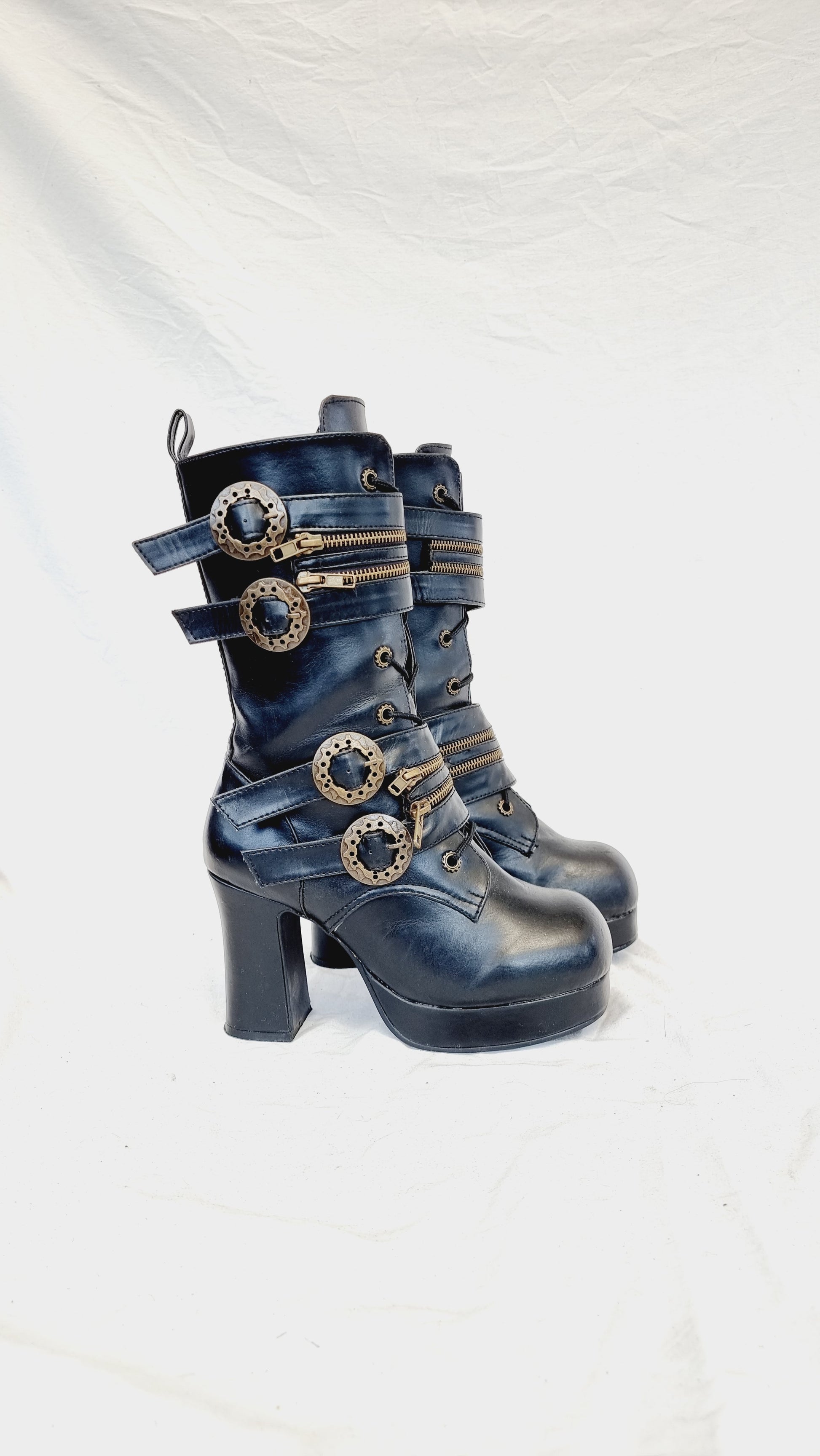 Rare black leather Demonia boots with chunky stiletto heels and Victorian style buckles. The buckles are fully adjustable, but there are also inner zips for ease of use. Like most Demonias these have chunky platforms, but they aren't so big they can't be used daily. Rather than a full-on platform, the sole is a couple of inches, made of high quality anti aquaplaning rubber from the 90s / y2k era - the golden age when chunky boots reigned supreme!