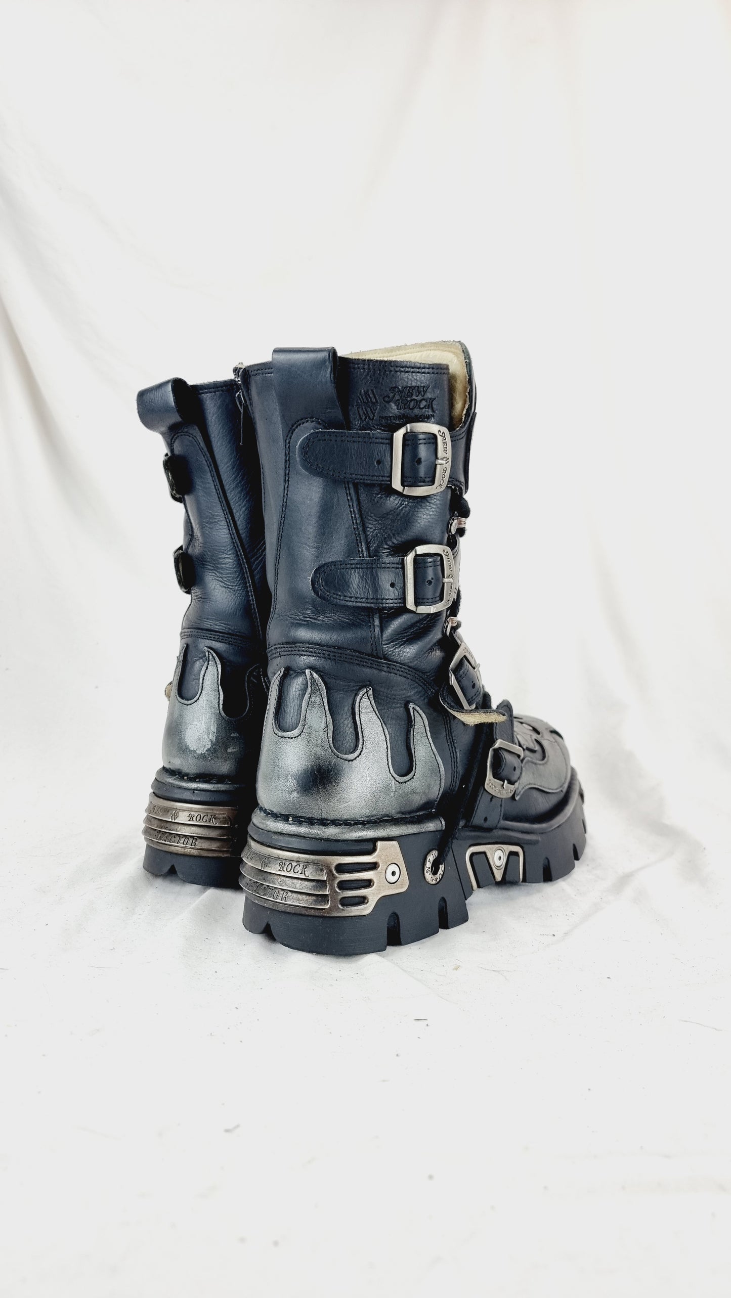 Leather and metal buckled New Rock boots with lace up fronts and buckled straps. These tower boots feature a demon skull design and a fire / flame pattern at the top and back. Black and silver, they sit about half way up the calf. Like most New Rocks these have chunky platforms, but they aren't so big they can't be used daily. The buckles and laces are fully adjustable, but there are also inside zips for ease of use. Rather than a full-on platform, the sole is a couple of inches, made of high quality anti aquaplaning rubber from the 90s / y2k era - the golden age when chunky boots reigned supreme! These are excellent quality, restored vintage boots. Part of BBB's commitment to sustainability and fighting fast fashion means that all footwear sold are restored second hand shoes, or rare and unused deadstock pieces no longer in production. Whether you're an electro goth who's into cyber punk techwear and aggrotech styling, an e-girl who's into cosplay and combat costume, a metalhead who loves their punk rock aesthetic, a rivethead who's obsessed with reactor boots, a nugoth who adores anything harajuku or occult, a mallgoth who loves their grunge goblincore goodies, a biker chick who's into a glam rock and dieselpunk footwear, preparing for a Mad Max style post-apocalyptic wasteland where you ride a motorbike, or whether you fancy adding a steampunk twist to your Halloween outfit - you can be assured that these will help you to kick ass in any scenario! For more alternative chunky shoes and platforms for all occasions, please feel free to browse my store or get in touch.