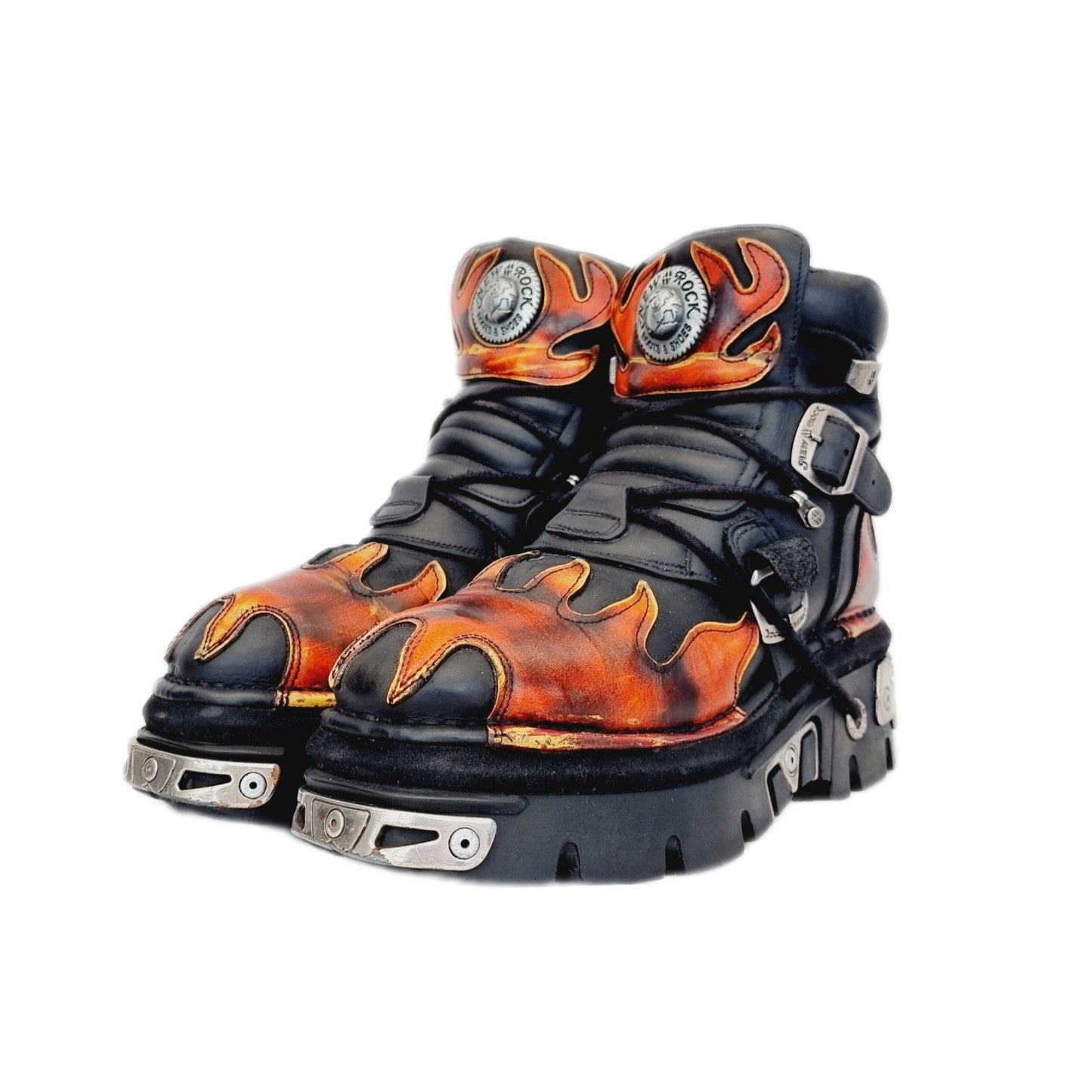 Rare vintage leather and metal New Rock tank boots with lace up fronts and buckled straps. Black and red in colour with flame designs, they sit at the ankle. The buckles and laces are fully adjustable to allow for wide or narrow feet.